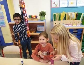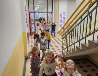 Kurz vor unserer großen Karnevalsfeier wollen wir unsere Klasse schmücken! Wir Füchse basteln gern und darum haben wir überlegt, dass wir eine meterlange Girlande herstellen wollen. Aus Papierstreifen haben wir mit einem Partner zunächst kürzere Ketten gebastelt. Als alle Papierstreifen verbraucht waren, haben wir alle Ketten der Klasse aneinander gefügt. Jetzt schaut doch mal, ist unsere Girlande nicht grandios geworden? So viele Kinder mussten beim Tragen der Girlande helfen. Wir waren unglaublich stolz auf 17 Meter Karnevalsdekoration! Jetzt kann Karneval kommen!