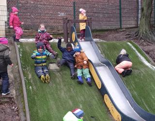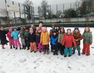 Im Januar hat es endlich richtig toll geschneit, Zeit zum Draußenspielen! Morgens kamen wir warm eingepackt in Schneeanzügen, Mützen und Handschuhen zur Schule. Auf dem Schulhof haben wir eine Winterolympiade veranstaltet, wer schlittert, rutscht oder wirft eigentlich weiter? Einige Füchse haben Schneeburgen gebaut, andere haben Schneeengel gezaubert. So ein Schneetag ist unheimlich schön, es sollte öfter schneien!