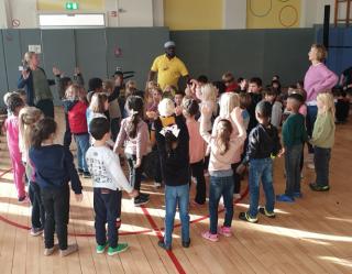 Täglich kam unser Trommellehrer Amadou, der mit allen RoBo-Kids in der Turnhalle getrommelt, gesungen und getanzt hat.