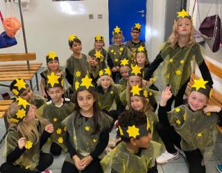 Gemeinsam probten wir die Geschichte von den Kindern Juju und Siyabonga, die in einem kleinen Dorf in Afrika wohnen und von ihren Eltern auf eine Reise geschickt werden, um die Zaubertrommel zu finden. Unterwegs treffen die beiden Kinder auf Bäume, Muscheln, Kürbisse und auf ein Fabelwesen. In der Nacht leuchten die Sterne für die beiden Abenteurer und das war unser Part! Auf dem Foto könnt ihr unsere leuchtenden Sternenkostüme sehen, die wir in der Projektwoche gebastelt haben. Alle Erstklässler haben gemeinsam einen Tanz aufgeführt, gesungen und Juju und Siyabonga so in den Schlaf begleitet. Obwohl wir so nervös waren, war die Vorstellung in der Bleichsteinhalle ein voller Erfolg!