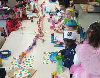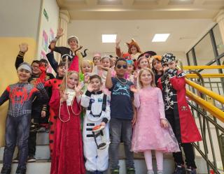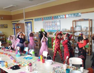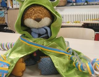 Heute ist Karneval und jeder kommt verkleidet zur Schule! Sogar Fiete, unser Klassenfuchs, hat sich als Froschkönig verkleidet. Herr Schlenga kommt als Oma und Frau Ruhrs ist heute ein Fuchs. Wir singen und tanzen, spielen mit den Luftballons und essen gemeinsam am langen Tisch ein leckeres Frühstück. Gerade, als wir wieder lostanzen wollen, kommen Kinder aus anderen Klassen und holen uns zur Riesenpolonaise ab. Wir fädeln uns ein und holen aus den anderen Klassen alle RoBo-Kids ab, das ist ein Spaß! Gemeinsam tanzen wir in der Aula zu lauter Musik, auch die Erwachsenen tanzen mit. Später gibt es in der Klasse noch ein Süßigkeitenbuffet, das rechtzeitig zum Ende der Party aufgegessen ist. Nun kann das lange Wochenende starten!