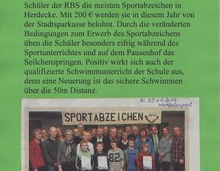 Innerhalb eines Jahres kann das Sportabzeichen erworben werden. Voraussetzung ist bei Grundschüler*Innen das Schwimmen über 50 m. Vier Disziplingruppen sind zu bewältigen: Koordination, Schnelligkeit Kraft und Ausdauer. Während des Sportunterrichtes und in Ergänzung zu den Bundesjugendspielen erhalten die Schüler*Innen Zeit, ihr Sportabzeichen zu erlangen.