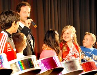 Soweit uns bekannt ist, sind wir die einzige Grundschule, die eine eigene Steel-Drum-Band unterrichtet. Unsere Schüler können sich im Projektunterricht ab Klasse zwei mit den Steel-Drums vertraut zu machen. Ab dem dritten Schuljahr werden auch kleinere Auftritte im schulischen Rahmen ermöglicht. Die musisch ambitionierten Kinder dürfen dann auch intensiver musizieren. Unsere Steel-Drummer sind im Laufe der Zeit schon bekannt geworden und werden regelmäßig von verschiedenen Veranstaltern zur musischen Untermalung eingeladen. Hier stehen sie gemeinsam mit Jörg Hartmann , auch bekannt als Tatort Hauptkommissar Peter Faber auf der Bühne.